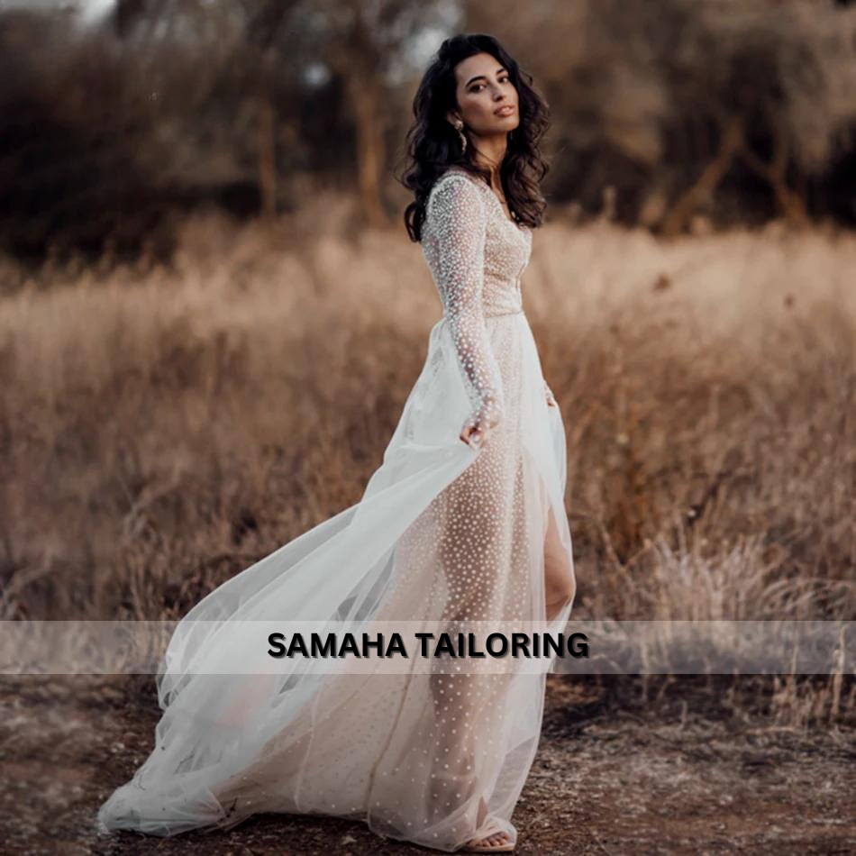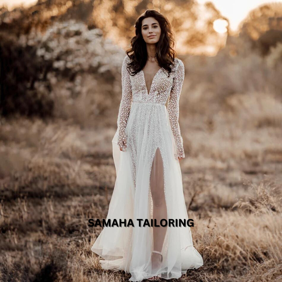 تمتعي بأناقة لا مثيل لها في يومك المميز مع فستان Allem. يتميز الفستان بفتحة رقبة على شكل حرف V وأكمام طويلة تضفي لمسة رومانسية، بينما يضيف التول الشفاف لمسة من السحر. مثالي للعروس ذات الروح الحرة التي تبحث عن إطلالة حالمة وساحرة.