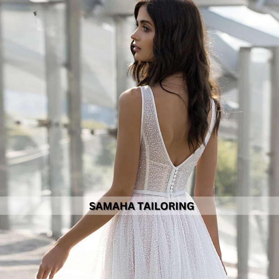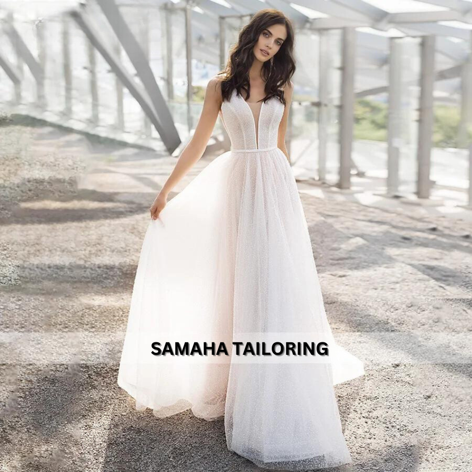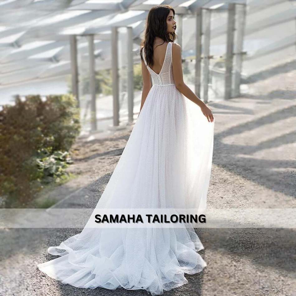 أبهري الجميع في يومك المميز بفستان زفاف Amara Bliss A-Line. يتميز هذا الفستان بتصميم مزين بالترتر اللامع وفتحة رقبة عميقة على شكل حرف V وظهر مكشوف، مما يضفي عليه لمسة من الأناقة والحداثة. التصميم بدون أكمام والقماش خفيف الوزن مثاليان لحفل زفاف على الشاطئ. اشعري بالثقة والجاذبية وأنت تسيرين في الممر بهذا الفستان المذهل.