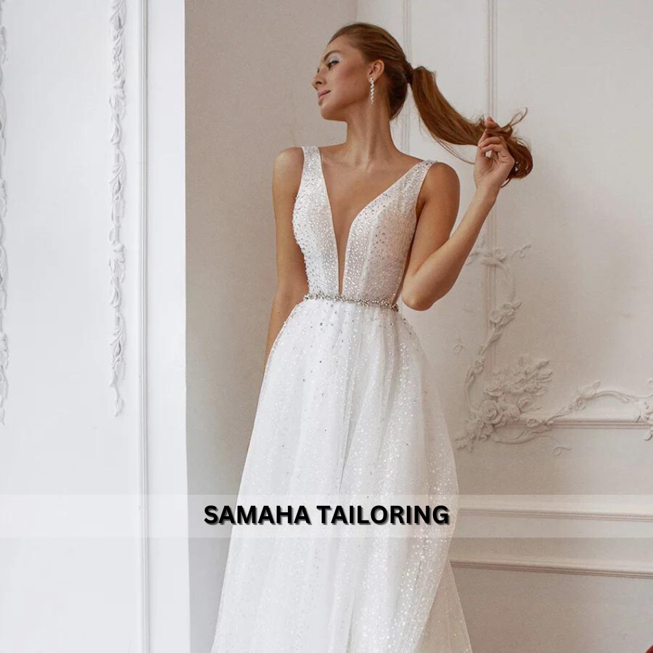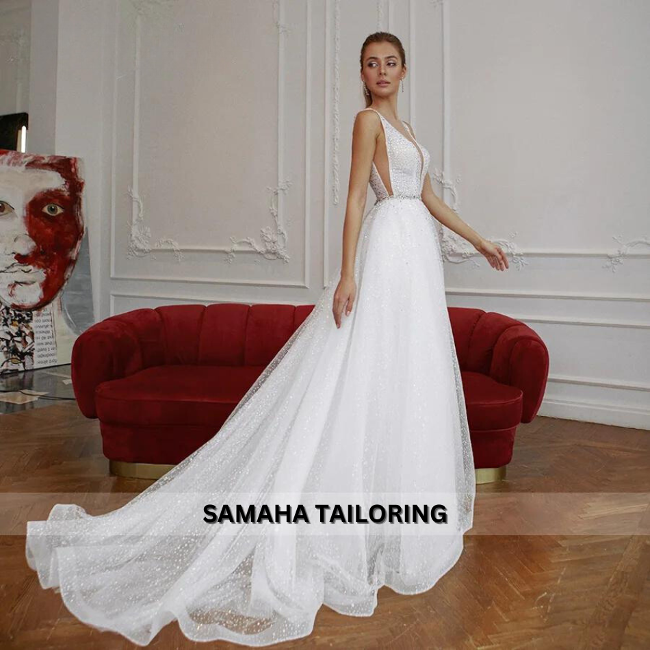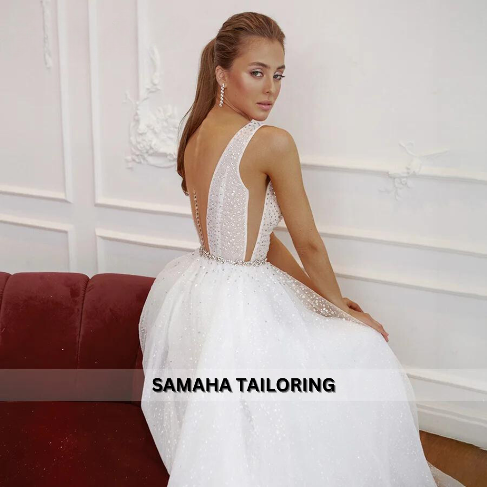 Experience the perfect blend of elegance and sophistication with the Jade Deep V-neck Tulle Wedding Gown. Adorned with sparkling crystal sashes, the deep V-neckline and tulle fabric create a stunning silhouette that will make you feel like a true princess on your special day.