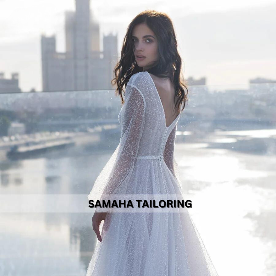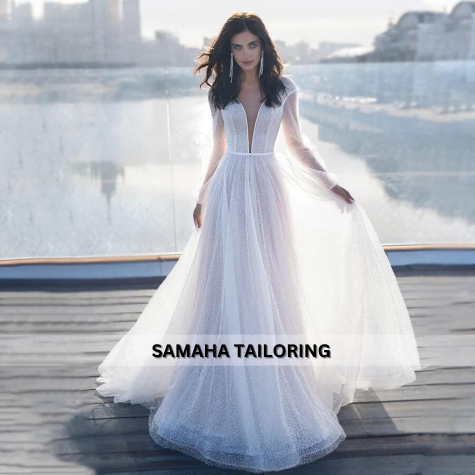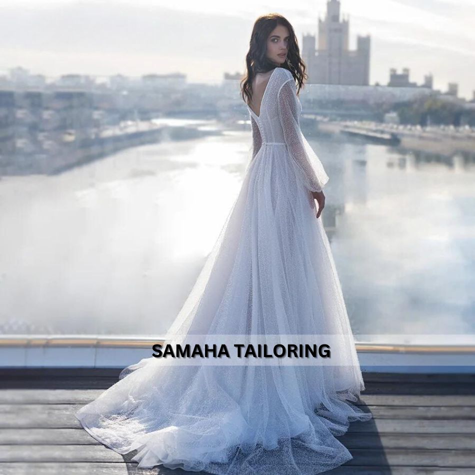 Unleash your daring style with the Indi A-Line Wedding Dress. This stunning dress boasts a deep V-neck and puff sleeves for a bold, yet elegant look. The shiny sequined sashes add a touch of glamour, while the mid back design adds a modern twist. Perfect for a risk-taking bride who wants to stand out on her special day.