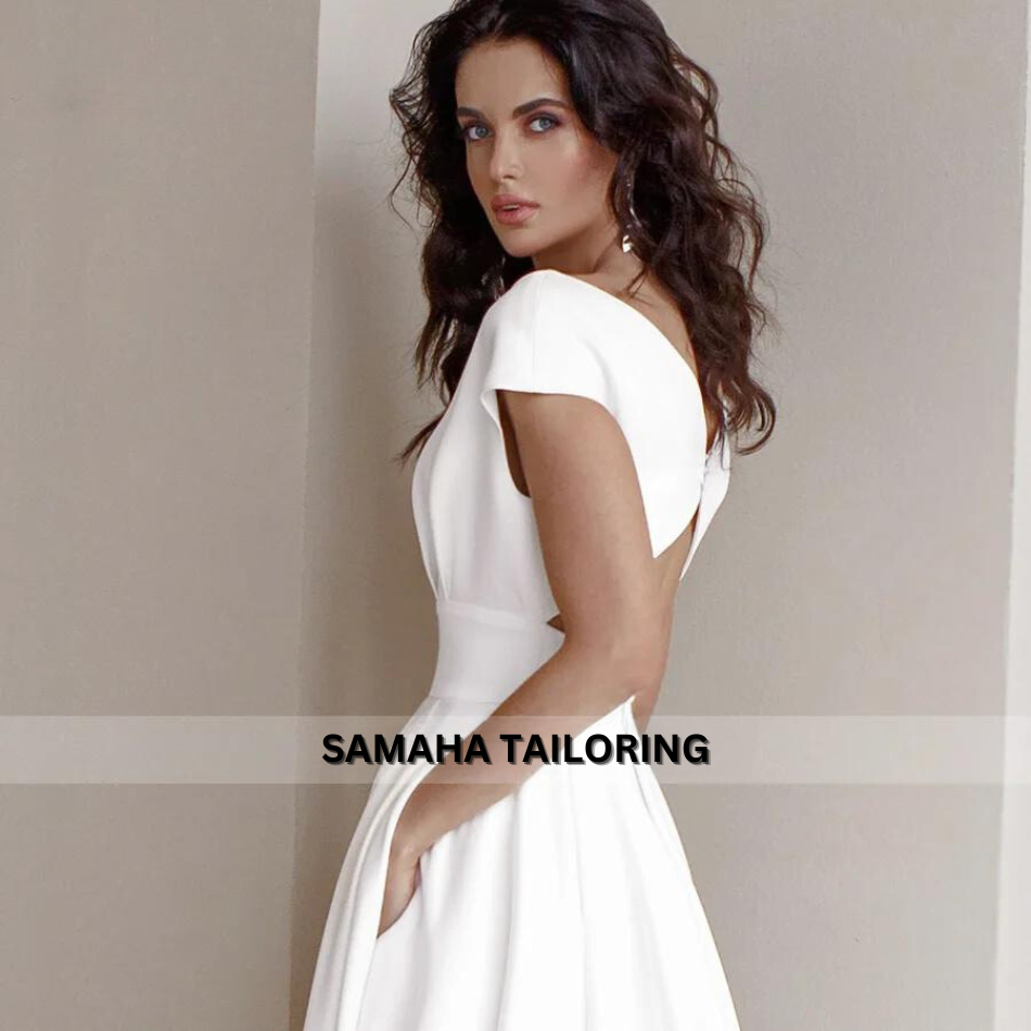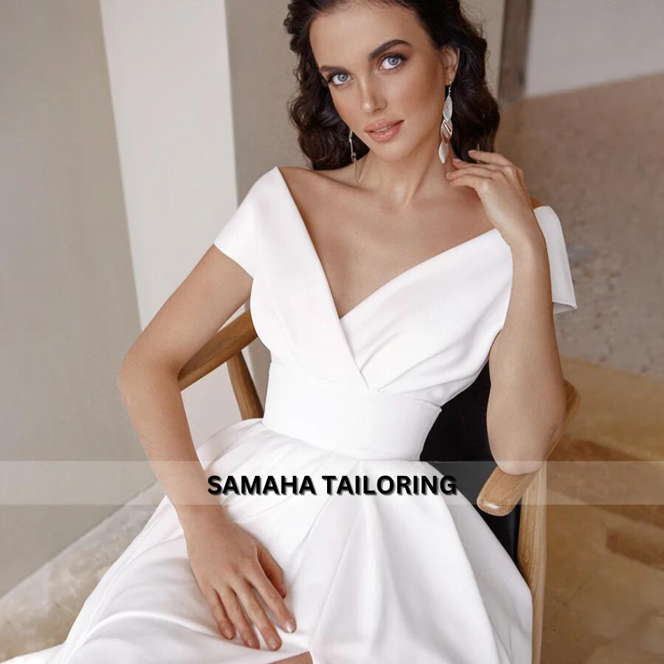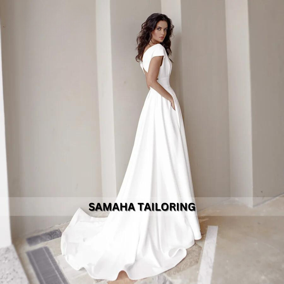 Expertly crafted for your special day, the Harper wedding gown features a sleek satin material with a flattering V-neckline. Designed with convenience in mind, this gown includes pockets to keep your essentials close and a chic slit-hem for added elegance. Make a statement with style and practicality all in one stunning dress.