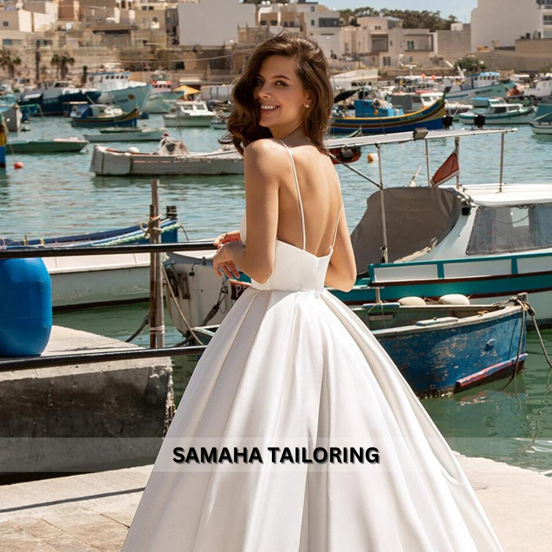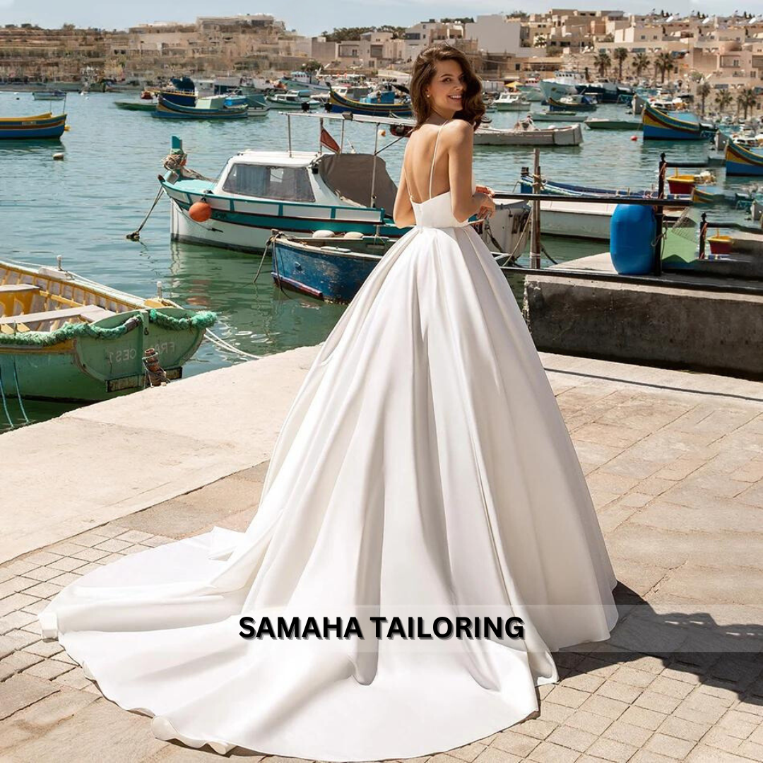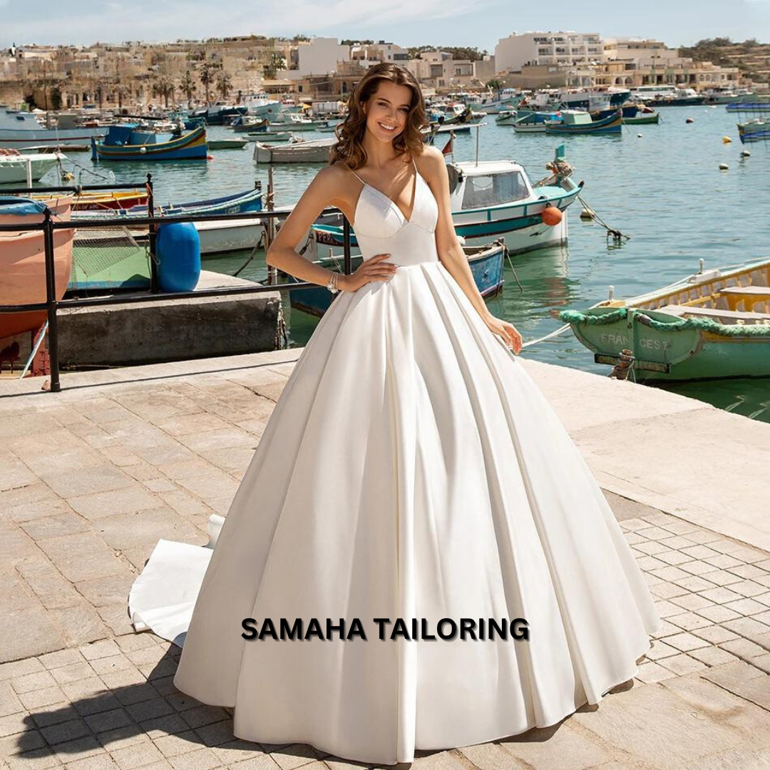 Take the plunge with the Isabella Ball Gown Wedding Dress! This sleek satin gown features a daring V-neck and delicate spaghetti straps, designed to accentuate your figure and add a touch of allure. With a stunning court train, this elegant bridal gown is perfect for the bold and adventurous bride.