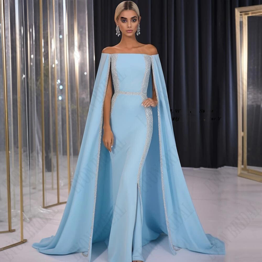 Introducing the "Celeste" gown, a vision of ethereal elegance and modern sophistication. This stunning gown features a sleek, figure-hugging silhouette crafted from luxurious sky-blue fabric that flows effortlessly to the floor. The minimalist design is elevated by the exquisite detailing of sparkling crystal accents along the seams, adding a touch of glamour and refinement.