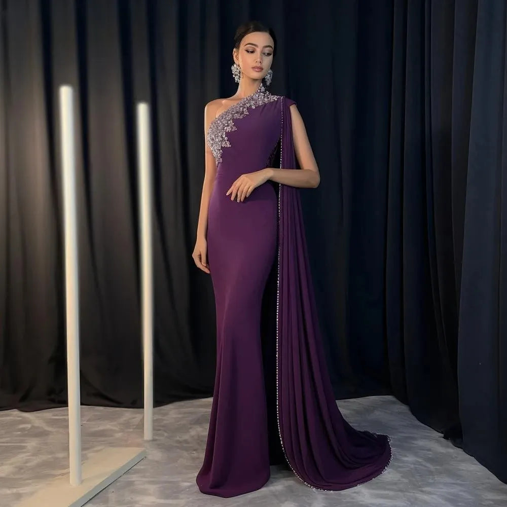 Introducing the "Lila" gown, an exquisite blend of elegance and contemporary sophistication. This striking dress features a one-shoulder design, gracefully adorned with intricate silver embellishments that cascade down the bodice, adding a touch of glamour and refinement. The rich, deep purple hue exudes luxury and confidence, making it an ideal choice for those who wish to stand out with grace